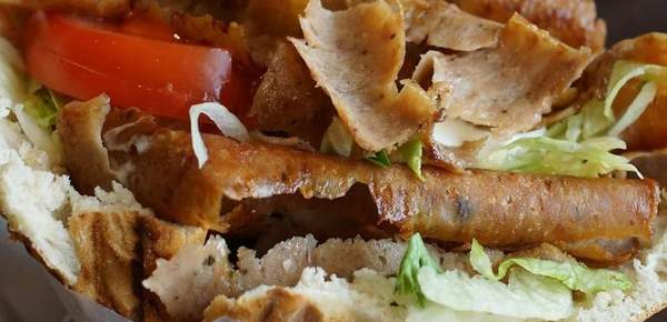 Pâo, carne kebab, alface, tomate, cebola, molho