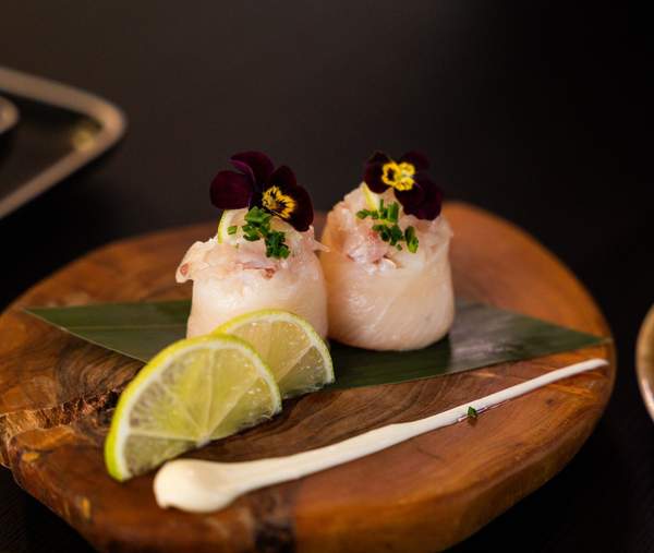 Vieira,togarashi,raspa de lima,ovas e molho Nikiri