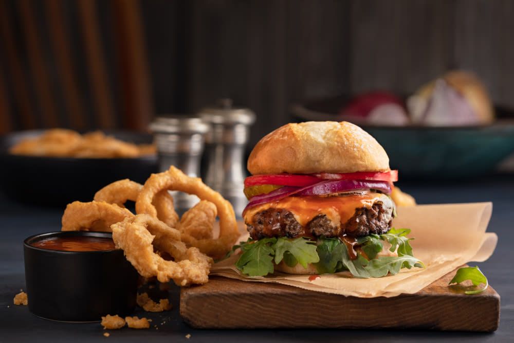 Chiflă burger, pulpă de vită marinată la cuptor, creveți pane, brânză cheddar, salată iceberg, castravețI murațI, ceapă roșie, sos tartar, 4 inele de ceapă incluse