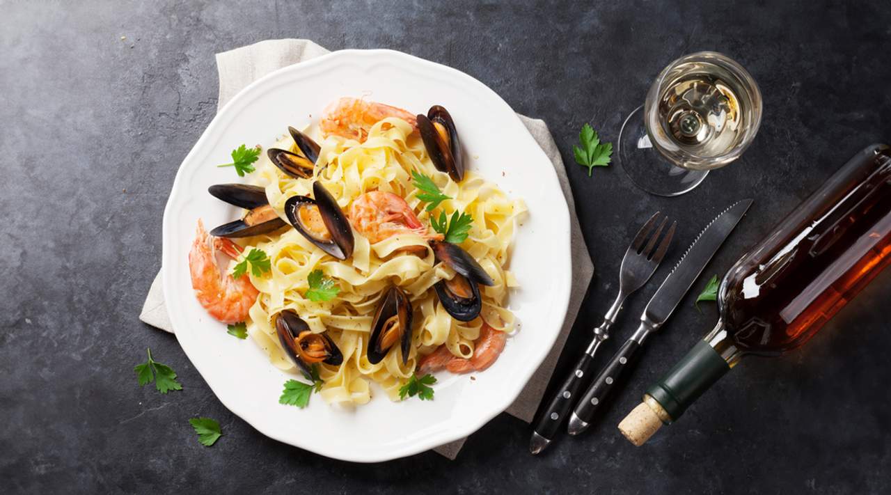 Spaghetti, creveti, unt, vin, parmezan, zucchini, smantana - 300g