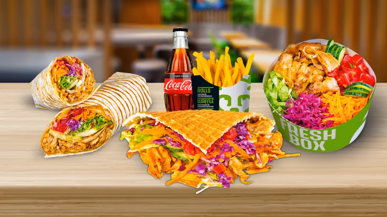 Meniul cuprinde 1x Rolls, 1x Waffle, 1x Box, 3x băuturi, 3x cartofi prăjiți, 3x sosuri King Rolls.
