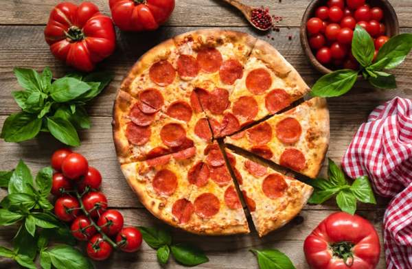 Aluat, sos de rosii, extra mozzarella, sunca, rosii, masline, ardei gras, oregano - 1.05kg