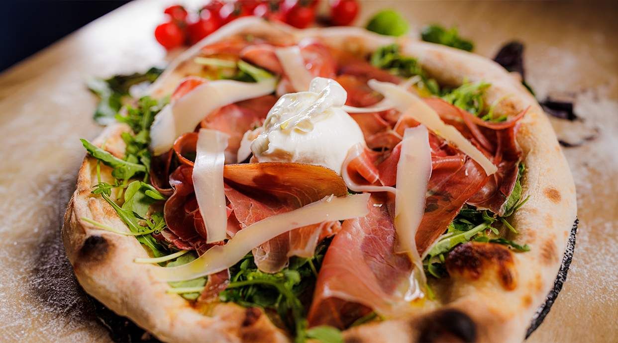 Aluat, fior di latte, rosii uscate, rucola, prosciutto crudo, burrata, parmezan