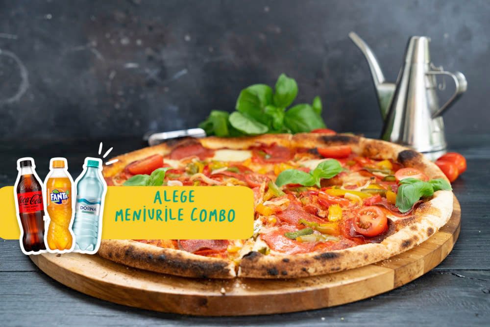 Sos de rosii, mozzarella, salam chorizo, carnati, sunca presata, ciuperci, masline, ardei gras + o doza bautura racoritoare