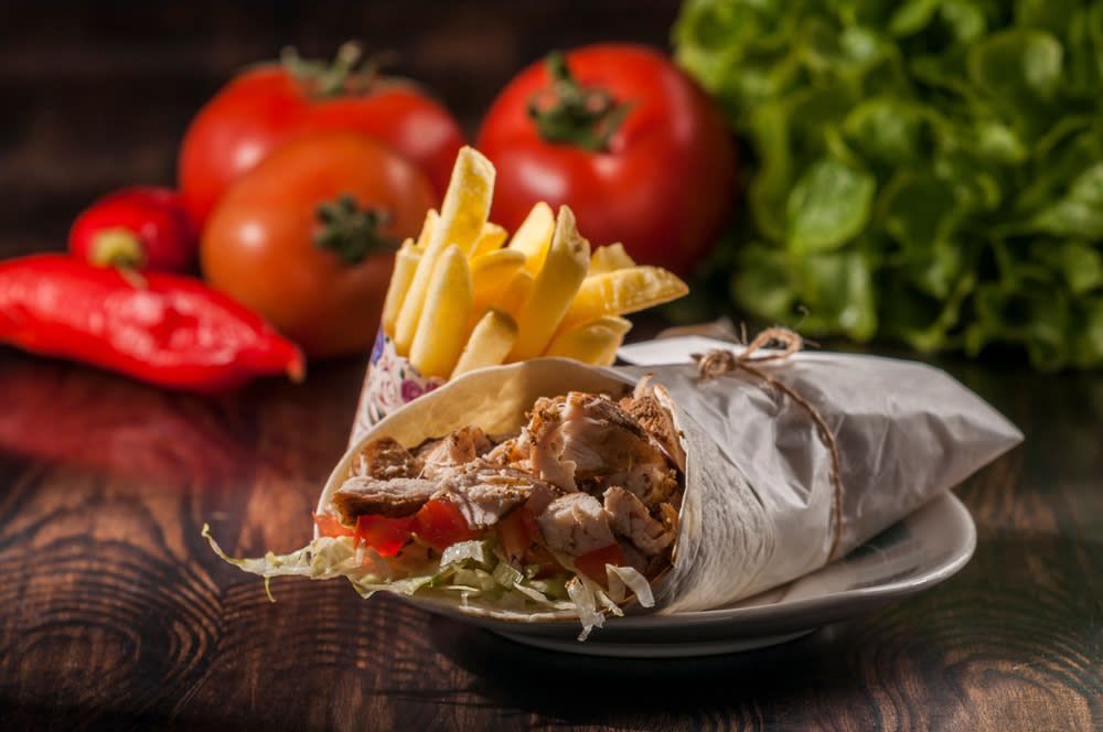 Lipie 110g, carne 90g, cartofi 60g, rosii - 10g, salata - 20g, ceapa - 10g, sos tzatziki - 20g Cca 320g Alergeni: lactoza Valori nutritonale: 170 kcal / 100 gr