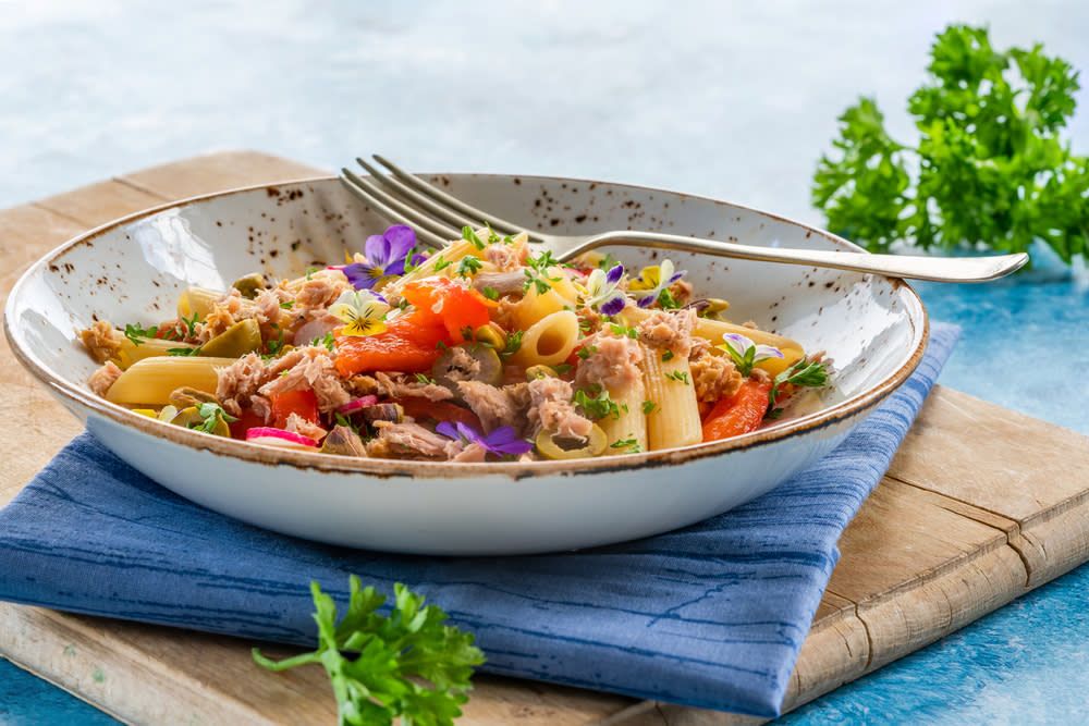 Ton, penne, anșoa, usturoi, roșii cherry, măsline, ulei de măsline, sare, piper - 350g