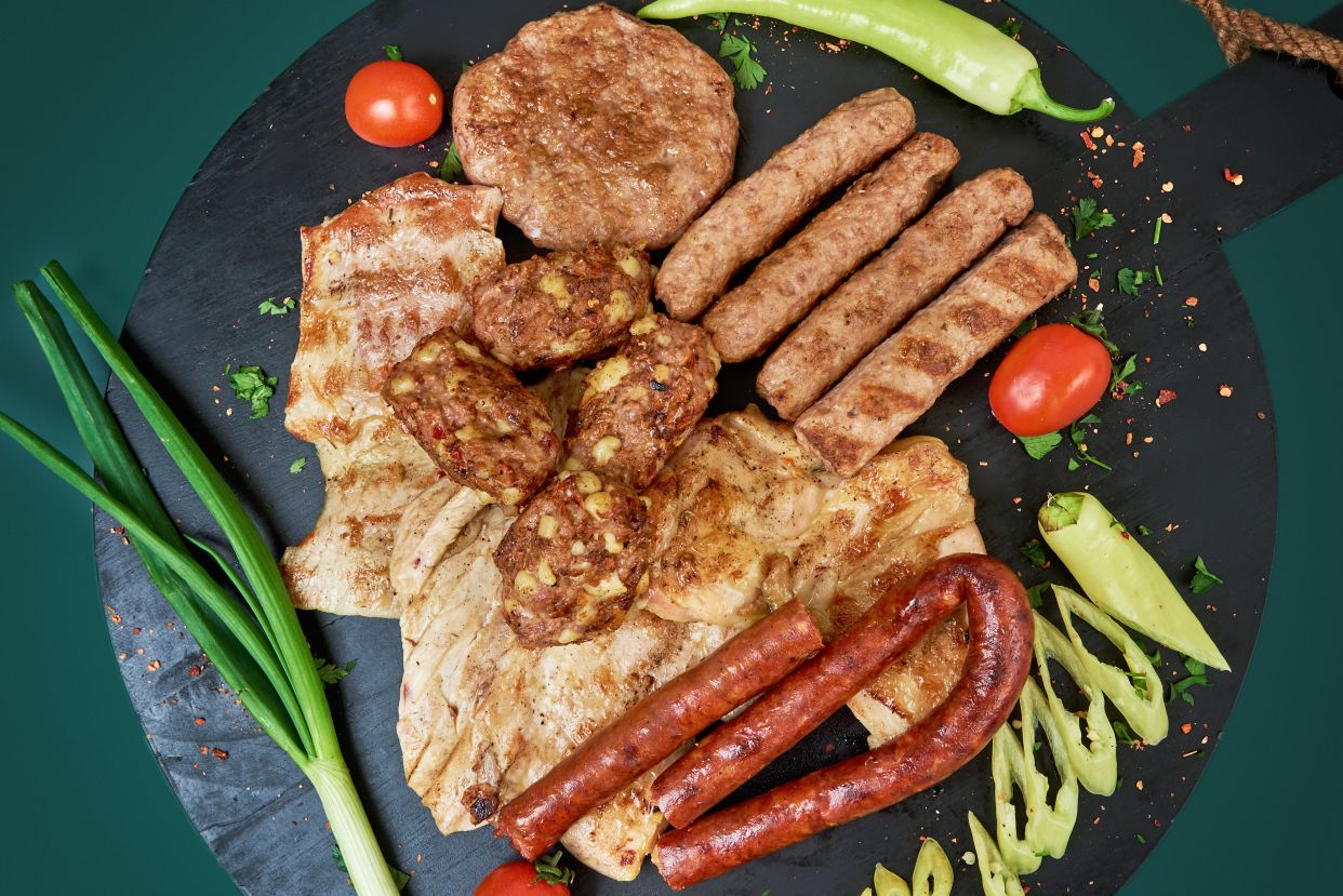Ćevapi 200 grama, uštipci 200 grama, pljeskavica 100 grama, batak 200 grama, pileće belo 250 grama, dimljena kobasica 160 grama, bela vešalica 100 grama