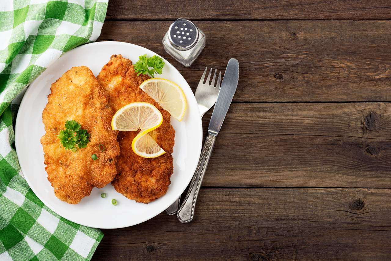 Pileće belo 200g, kajmak, vitaminska salata, dva sosa, pomfrit, lepinja