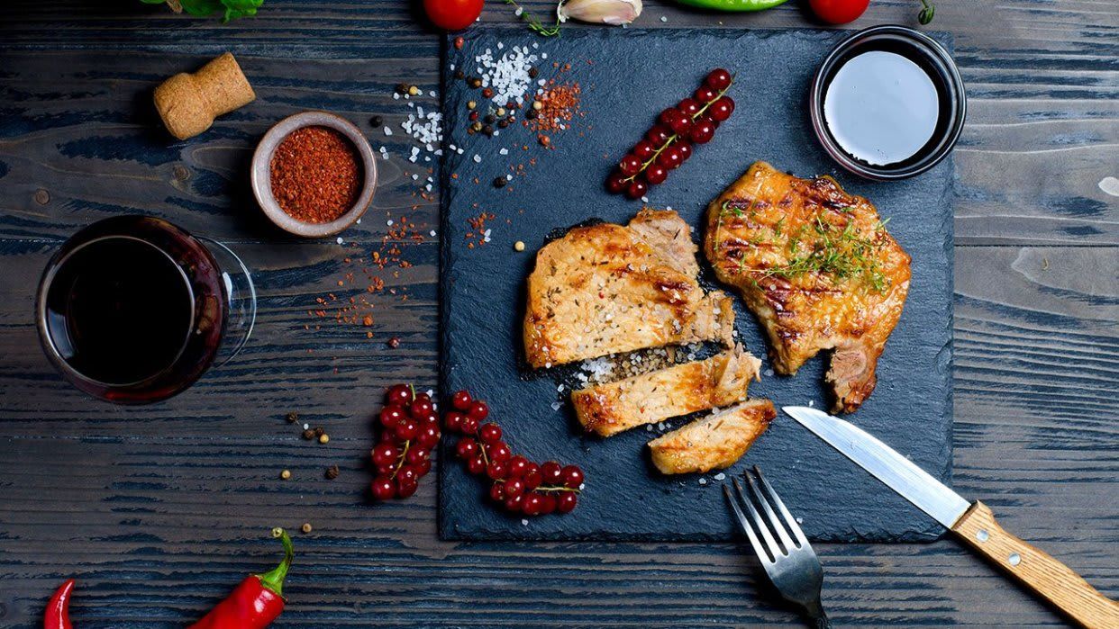 300 grama. Pohovani svinjski file punjen dimljenim suvim vratom i sirom, sa aromatizovanim krompirom i tartar sosom, limun