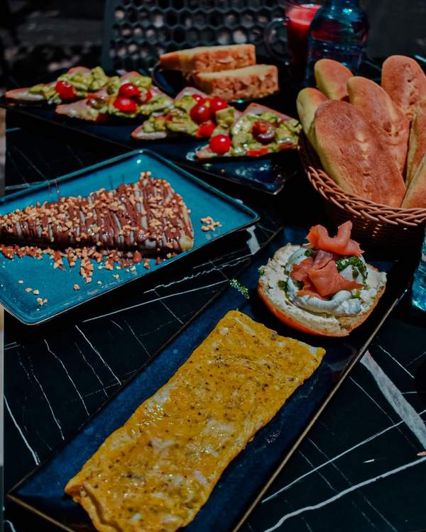 Café au choix, jus au choix, sorgho, bssissa aux fruits secs, fromage gouta à l'huile d'olive extra vierge, ojja aux merguez, corbeille de pain, salade de fruits frais, beurre, confiture, miel