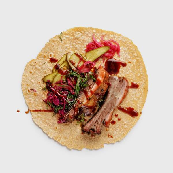 Лаваш власного виробництва, соус гранатовий , огірок свіжий, цибуля карамелізована , свинина рвана, помідор свіжий, масло вершкове , капуста Ким Чи , майонез копчений соус сирний , часниковий соус. 260 гр