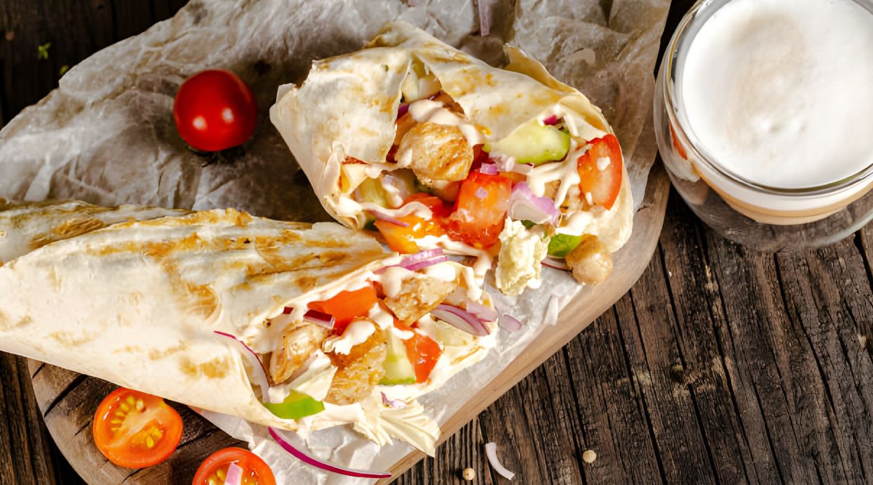 Лаваш, яловичина, капуста, помідор, огірок, кукурудза, сир Моцарела, соус часниковий