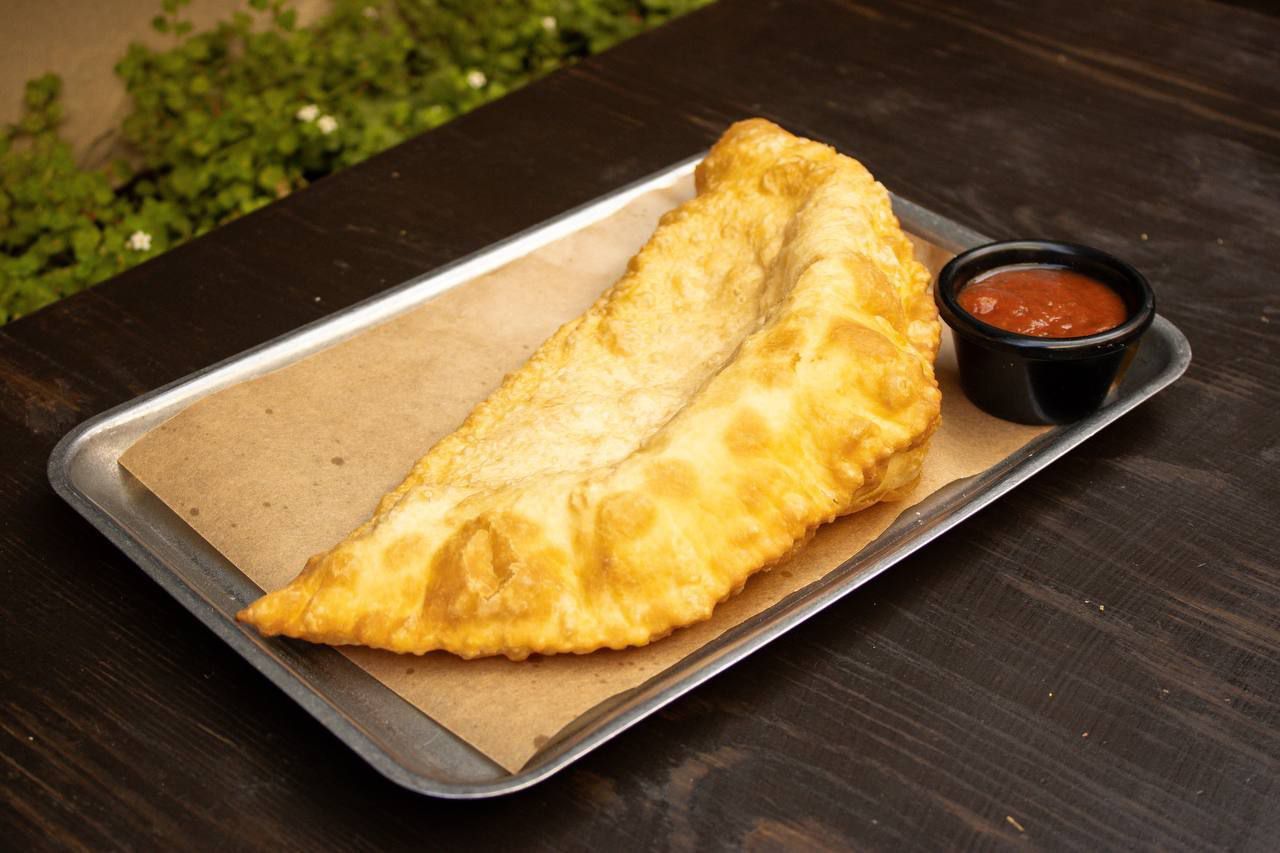 Хрумке тісто, фарш свиний, фарш телячий,сир моцарела,перець гострий,зелень, соус часниковий