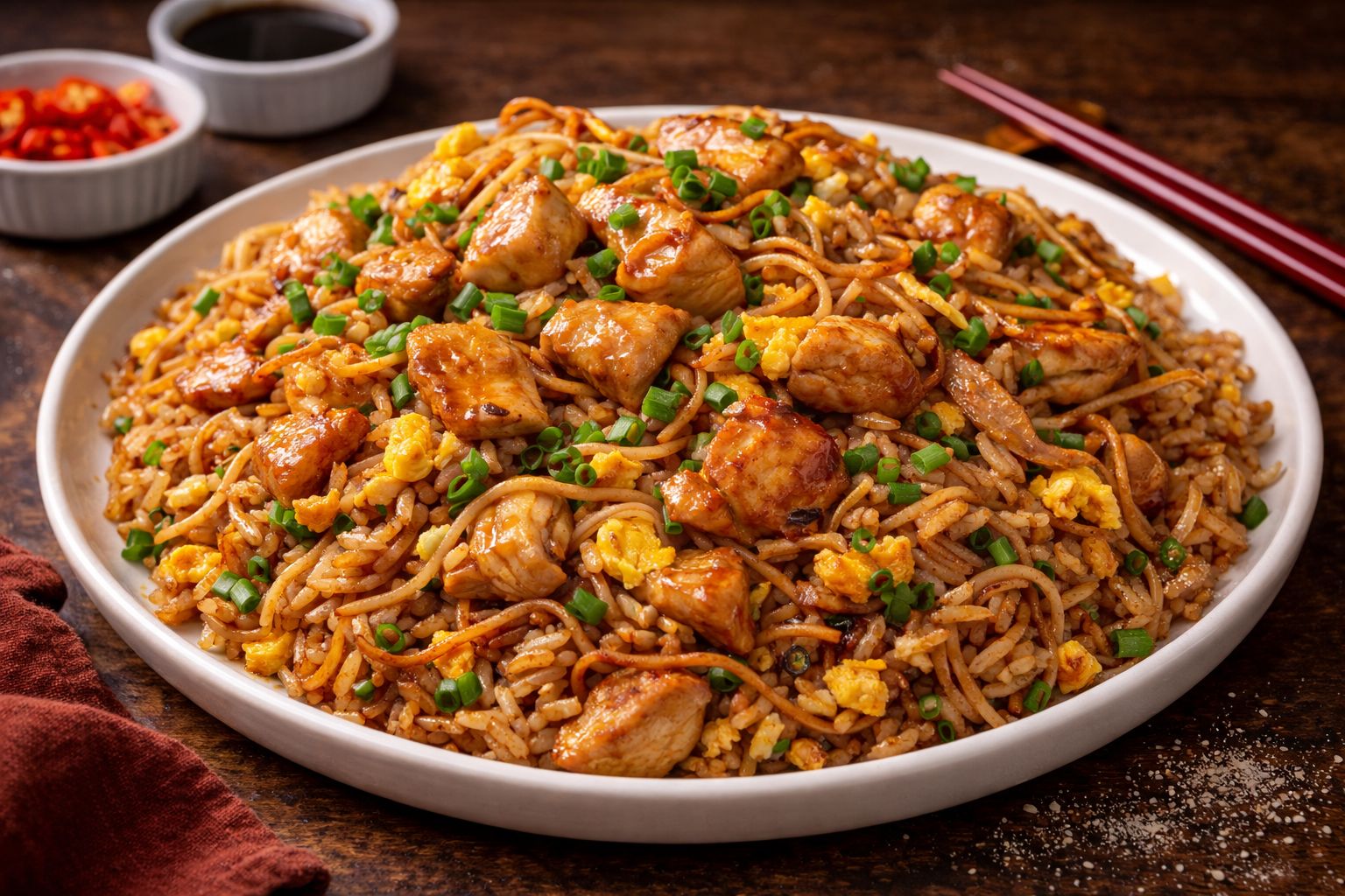 Arroz chaufa de cerdo asado, tallarines y brotes de soja.