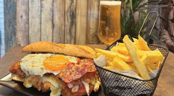 Salsa de tomates, mozzarella, jamón, tomates de estación en rodajas y mayonesa de hierbas. ** Incluye una ración de patatas fritas** ** No incluye bebida**
