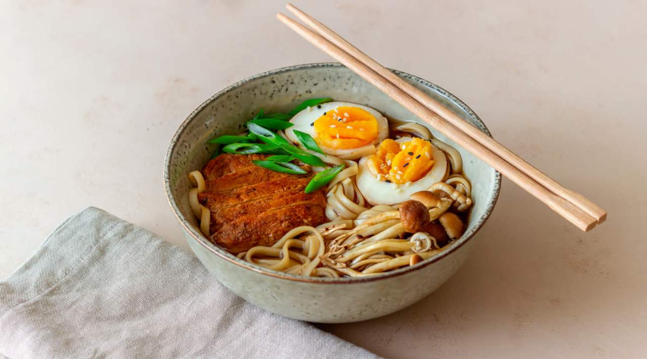 Receta especial de la casa. Ramen con pollo rebozado, algas, tofu frito, cebollino y huevo pochado