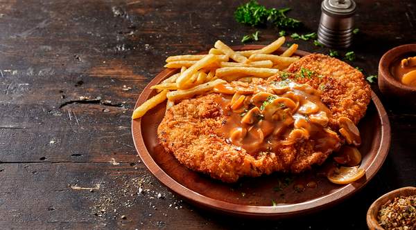 Pan rústico, milanesa de ternera, rodajas de tomates frescos y lechuga, acompañado de patatas fritas