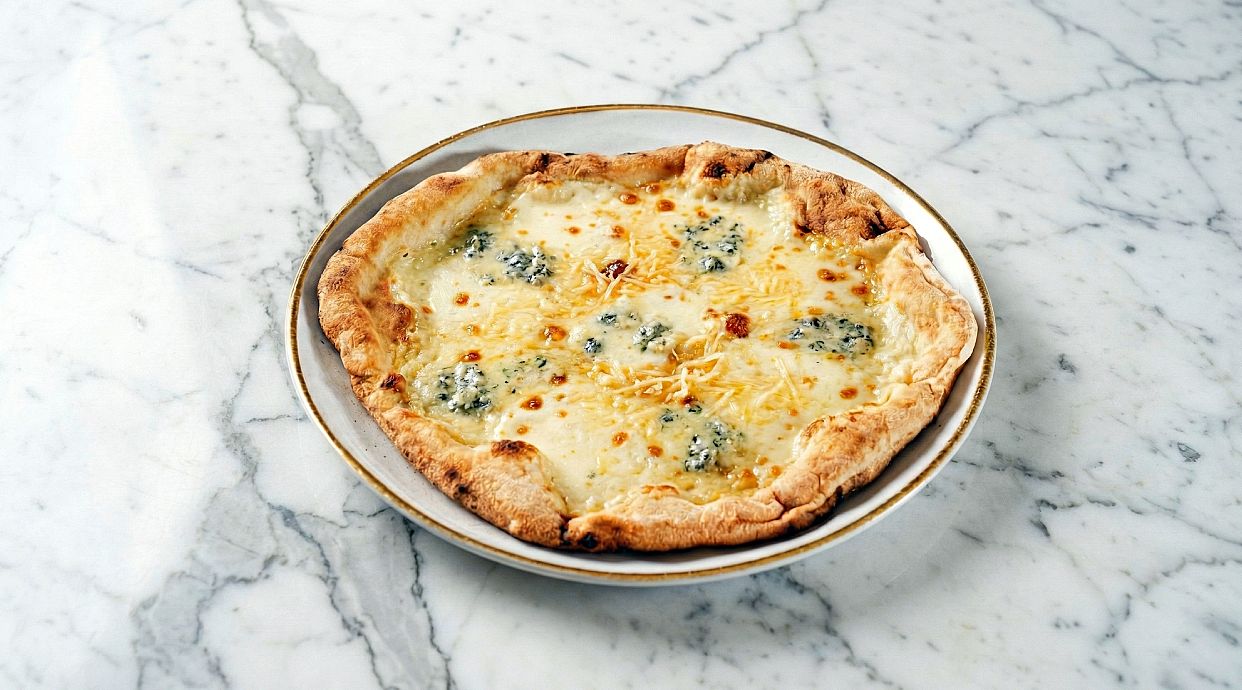 Pizza con una mezcla de quesos: mozzarella, tomates cherry, queso azul, emmental y rulo de cabra