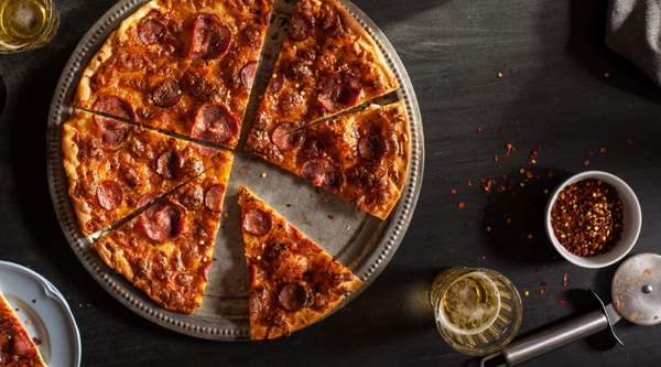 Tomate, queso, orégano, cebolla, pimientos, champiñones, bacón y pollo