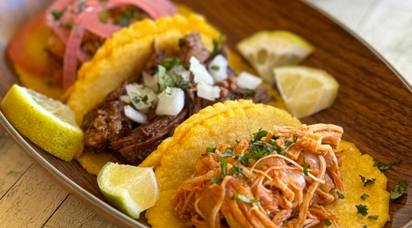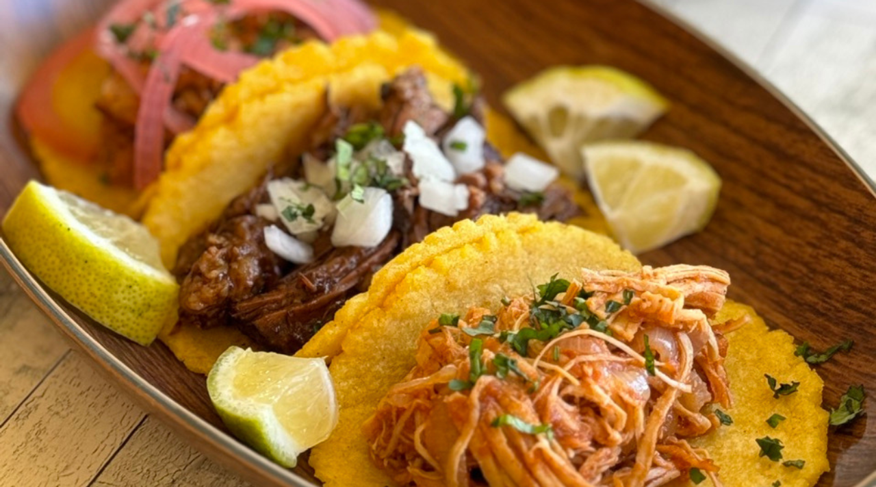 Tortilla de maíz crujiente rellenas de cochinita pibil acompañadas de guacamole y nata agria