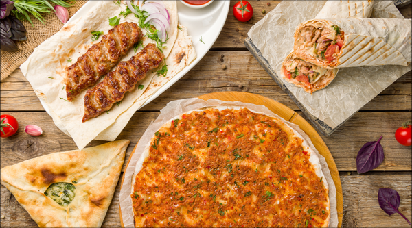 Carne de pollo, ternera o mixta enrollada en lahmacun con ensalada y salsa de ajo Chicken, beef or mixed meat wrapped in lahmacun with salad and garlic sauce