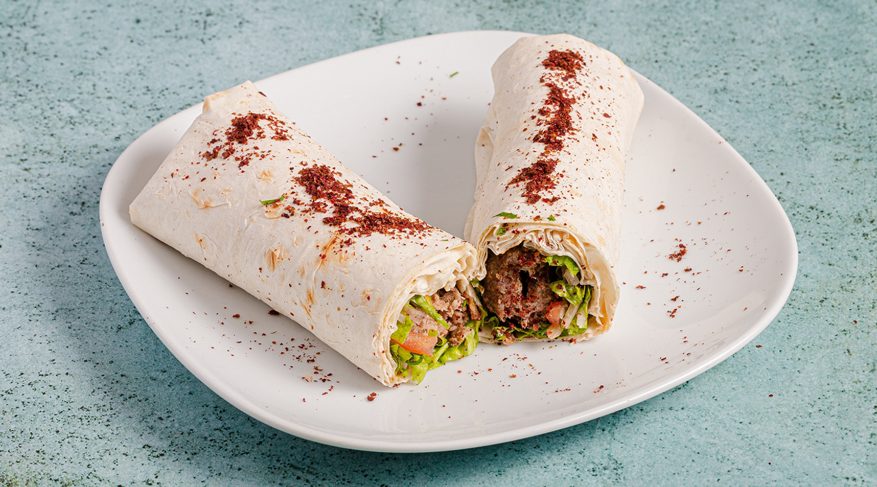 Adana kebab enrollada en pan con arroz, yogur y salsa de tomate Adana kebab rolled in bread with rice, yogurt and tomato sauce