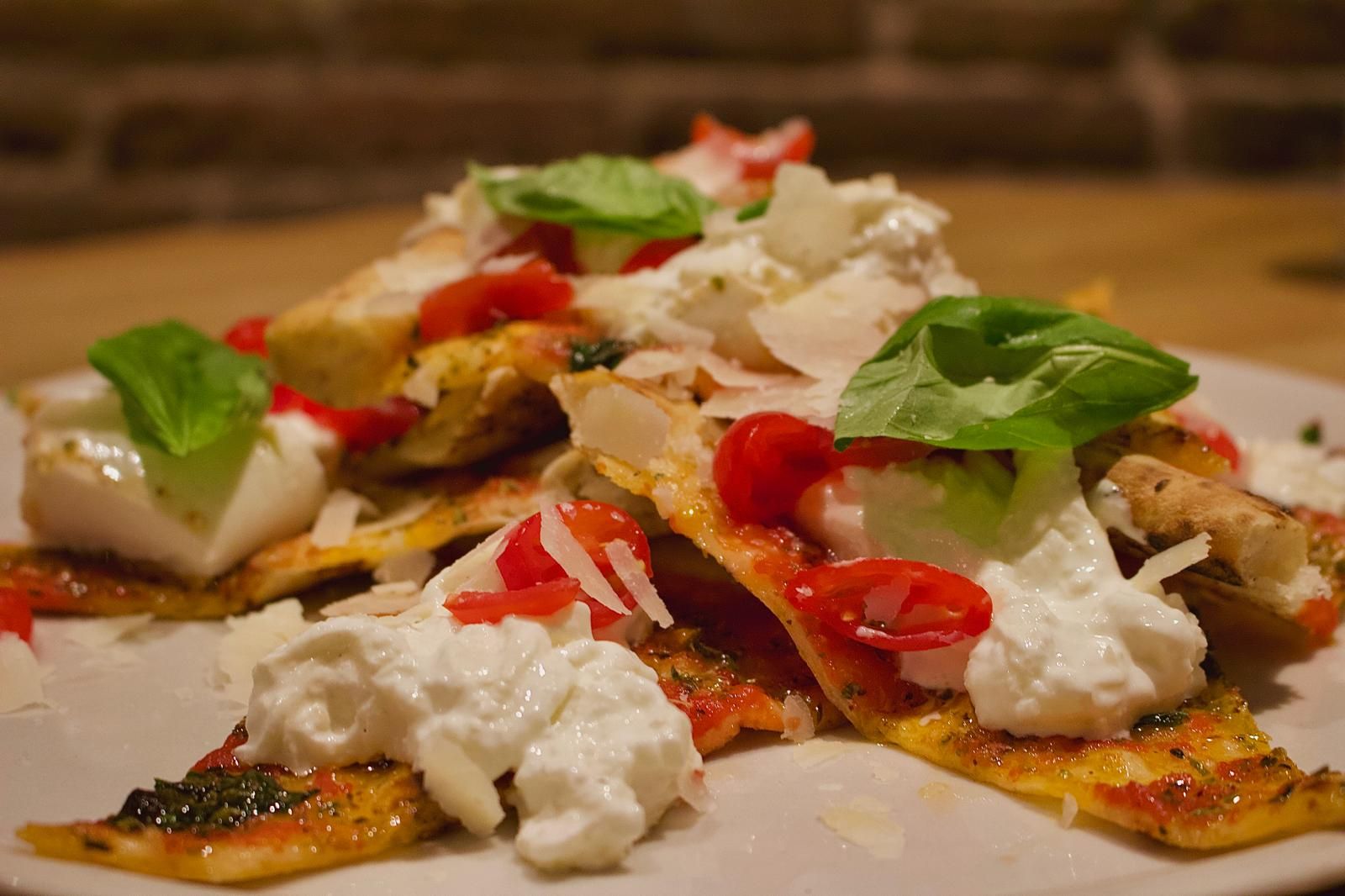 Con burrata, tomates del piennolo del Vesubio, crema de pistacho, parmesano, orégano y aceite de albahaca