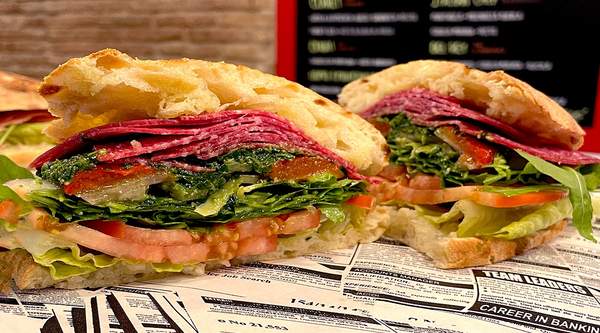 Focaccia crujiente con salami, queso manchego cortado a cuchillo, lechuga fresca y tomate natural. Un sándwich con personalidad y sabor auténtico.