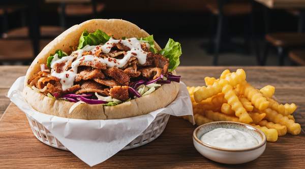 Disfruta de nuestro clásico plato kebab, con tierna carne y guarniciones frescas para una experiencia deliciosa y satisfactoria.