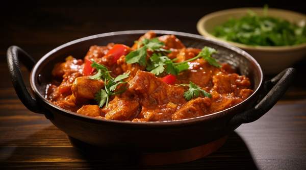 Trozos de pollo marinados en especias y yogur, asados a la perfección para un sabor suave y ahumado, luego cocinado en una salsa preferible acompañar con arroz polau o naan/porota