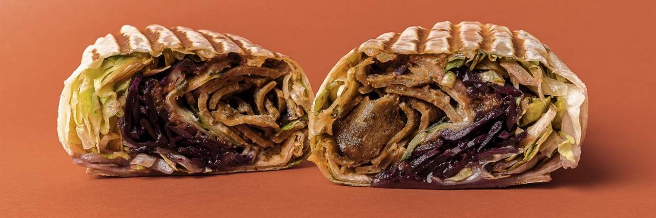 Seitán y Heura marinados en una tortilla de trigo con col encurtida, lechuga, pepino, cebolla y piparra. Con salsa de yogur de soja y salsa picante.