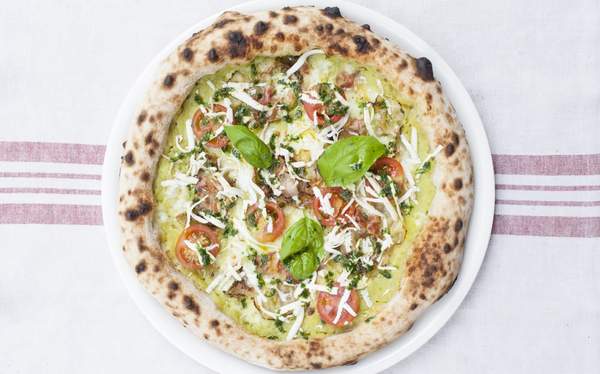 Tomate, mözza (mozzarella vegetal), berenjena, pimiento escalivado, cebolla roja, aceitunas y albahaca. MÖZZA" by VÄCKA: mozzarella vegetal hecha con almendra