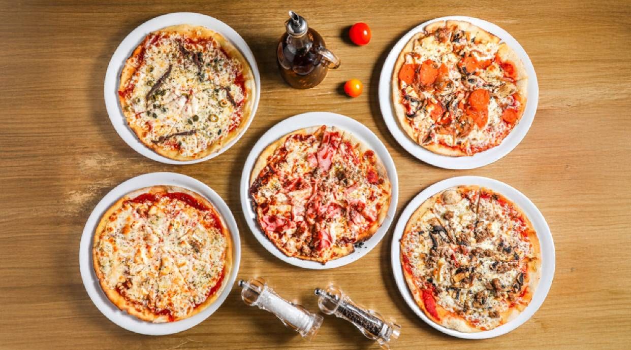 Tomate, queso, champiñones, pimiento, jamón dulce y alcachofas