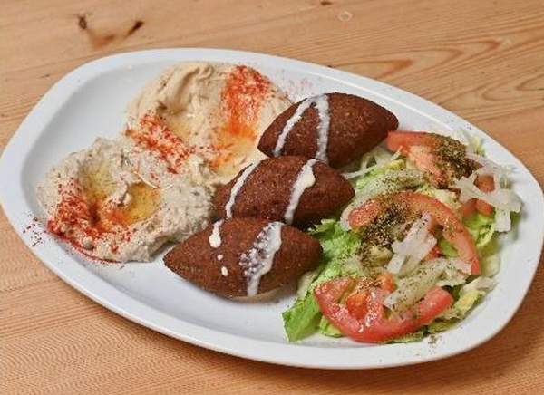 Croquetas de garbanzo fritas, lechuga, tomate, cebolla y salsa blanca