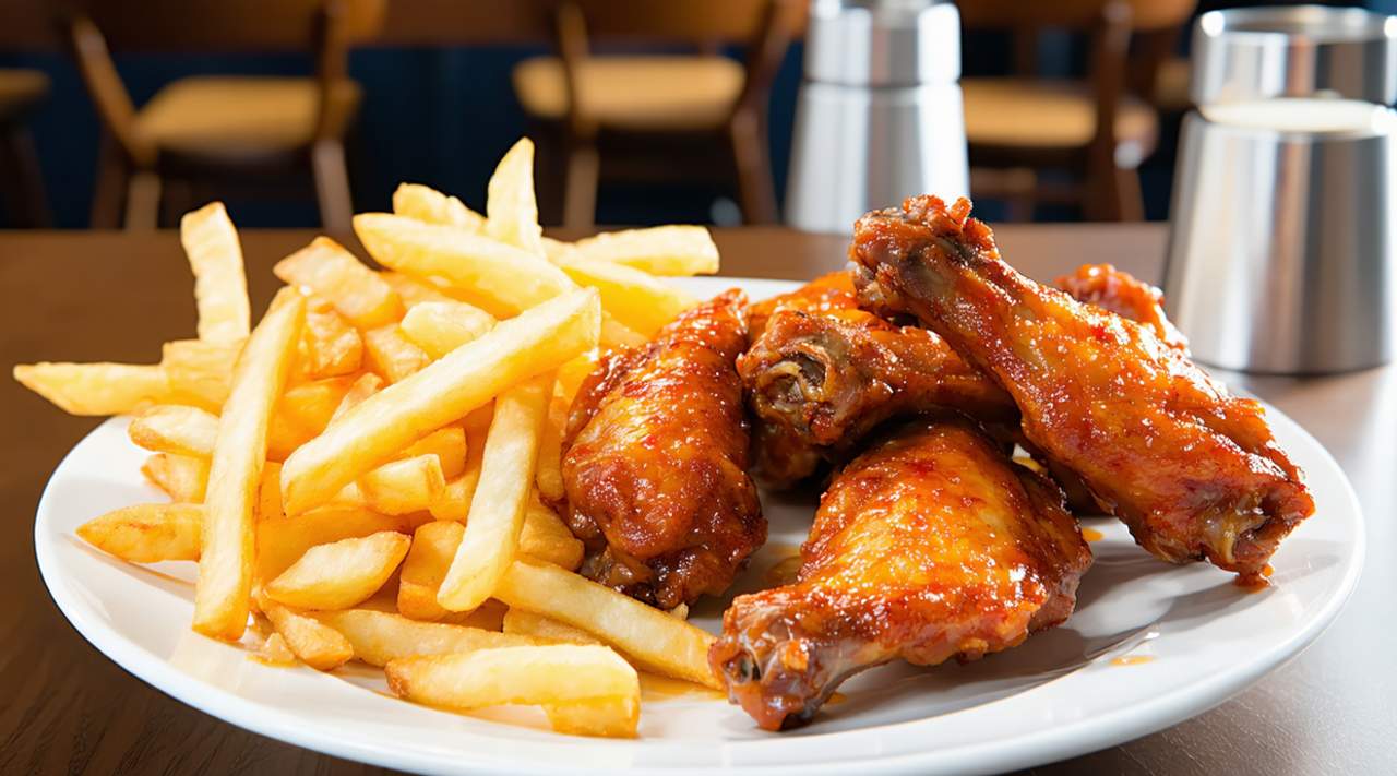 Alitas de pollo doradas y llenas de sabor, acompañadas con patatas y huevo