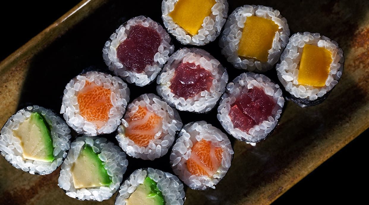 Combinación de makis pequeños de aguacate, salmón, atún y mango