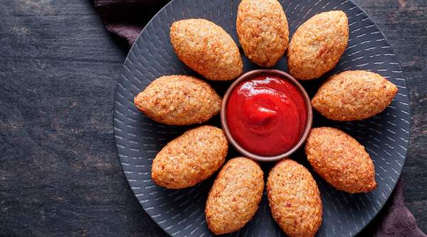 Croqueta de sémola de trigo rellena con un sofrito de carne picada cebolla con piñones o almendras.