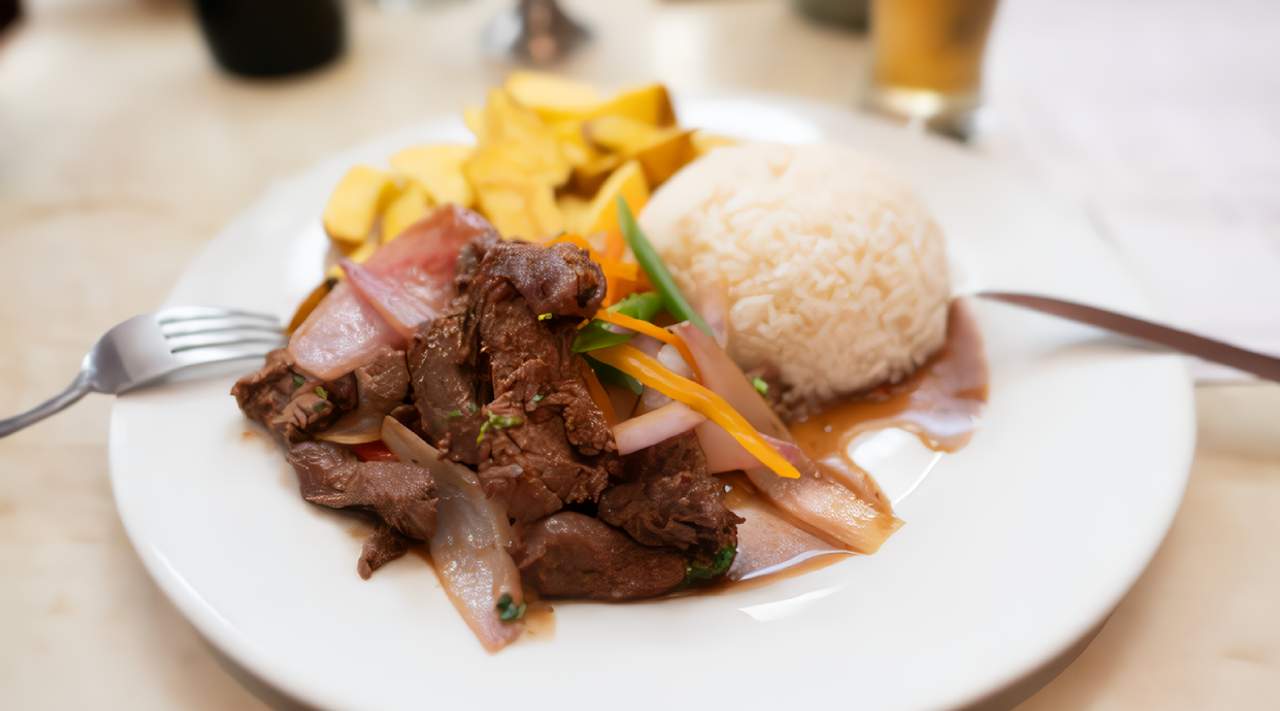 Arroz, lomo de ternera, tomate, cebolla y patatas