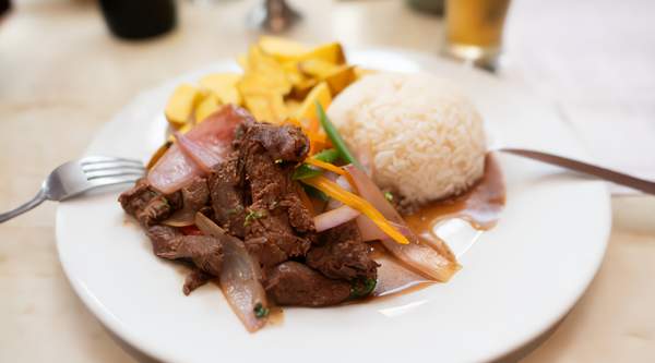 pasta tallarin, carne frita, cebolla, tomate, salsa de soya, condimentos