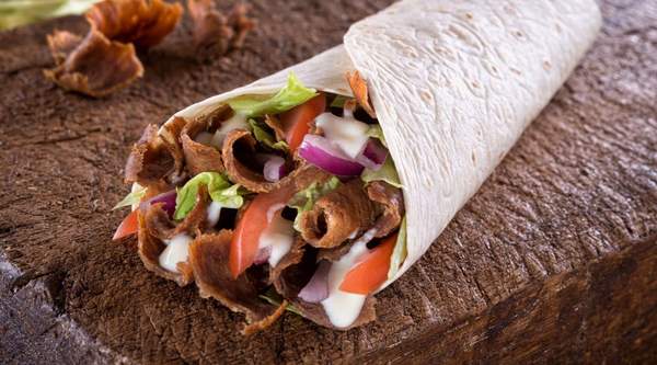 Tortilla de trigo, carne de kebab, salsa kebab, lechuga, tomate y cebolla