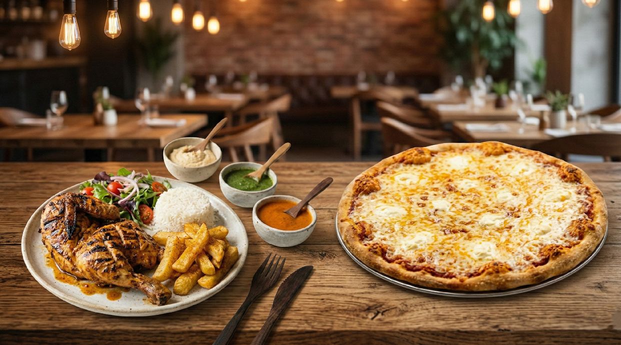 Pizza con salsa de tomate, mozzarella y carne de kebab halal.