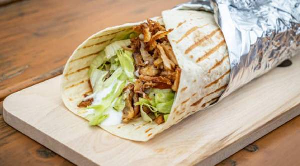 Carne sazonada, servido a tiras dentro de pan pita, ensalada y patatas fritas