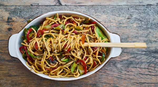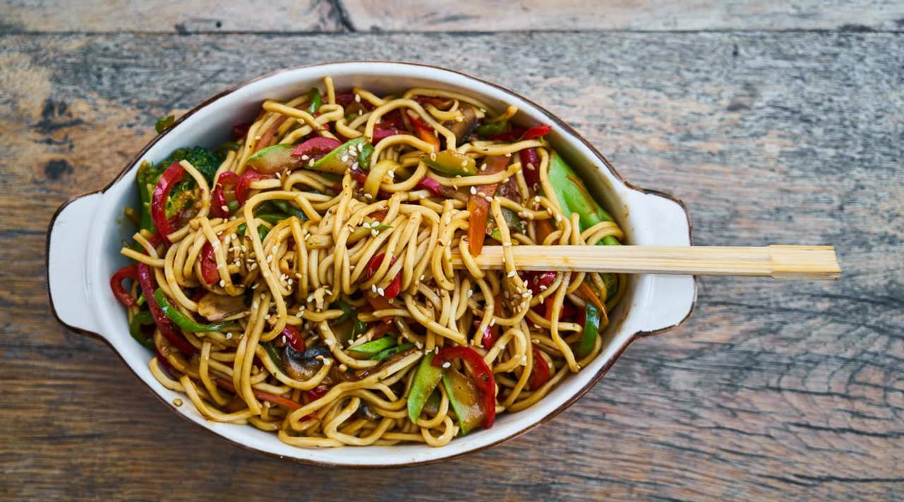 Tallarines salteados con una mezcla de carnes y verduras gamba y toque de picantes