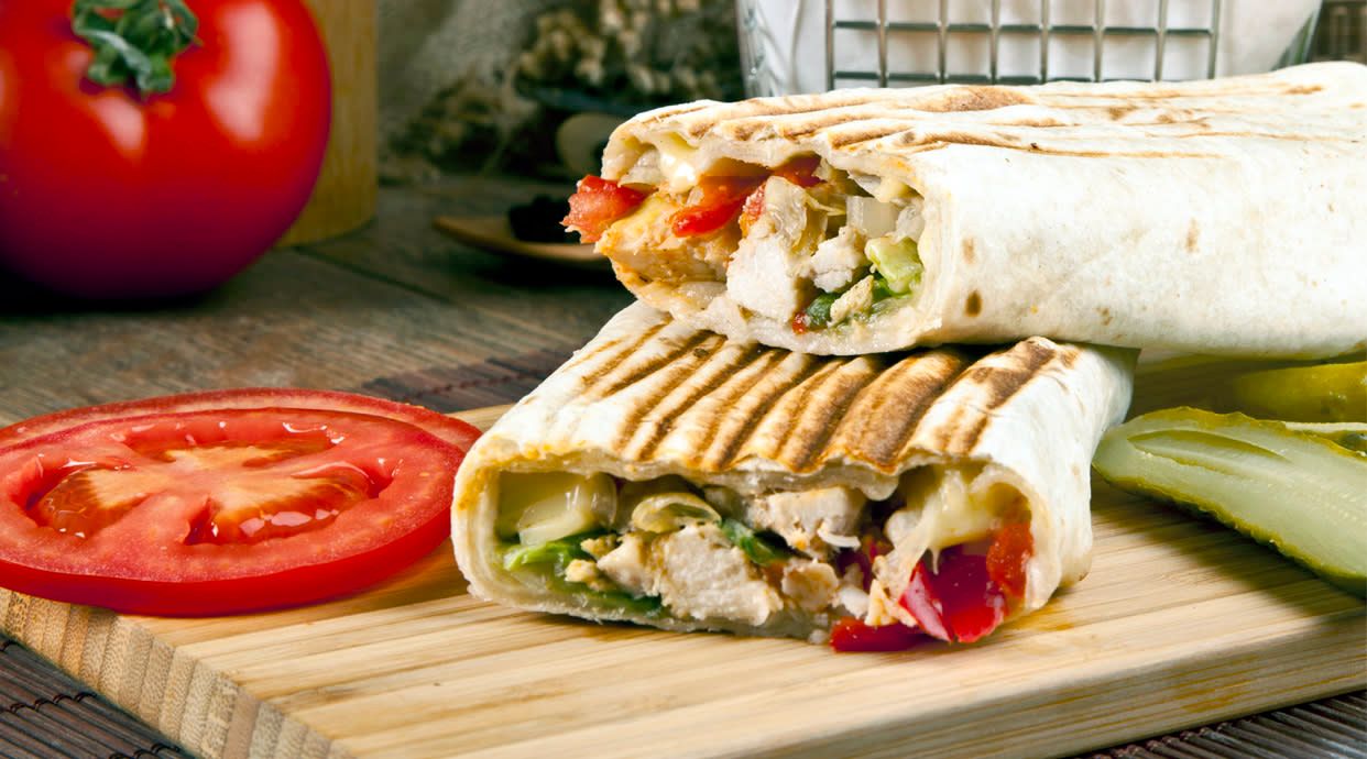 Pollo, lechuga, tomate, cebolla y sabrosas salsas. Pan enrollado