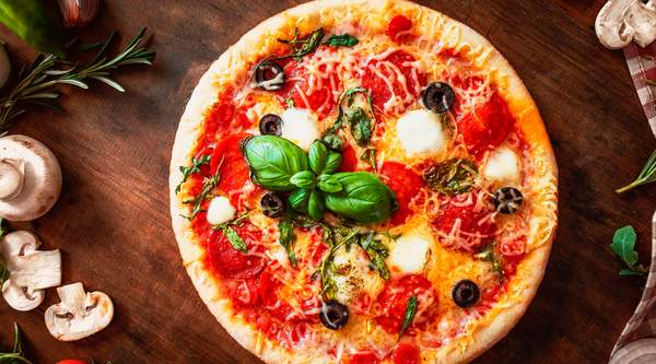 Tomáquet, alfábrega fresca, mozzarella fior di latte, pernil dolc xampinyons i orenga