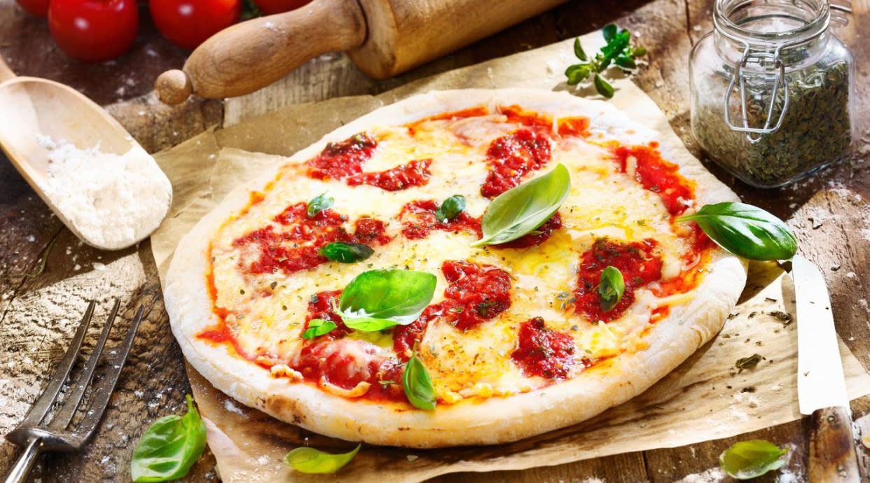 Tomate, mozzarella, jamón york, champiñón, atún y aceitunas negras