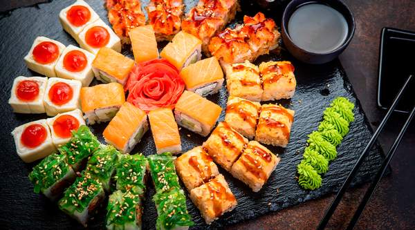 Con atún, salmón, pez mantequilla, tamago, langostino, anguila y surimi.