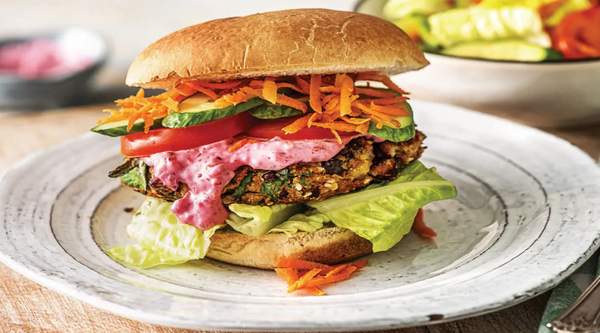 Hamburguesa vegetal con paté de tomate, lechuga, salteado de champiñones y cebolla, salsa Burggins y Vegginesa