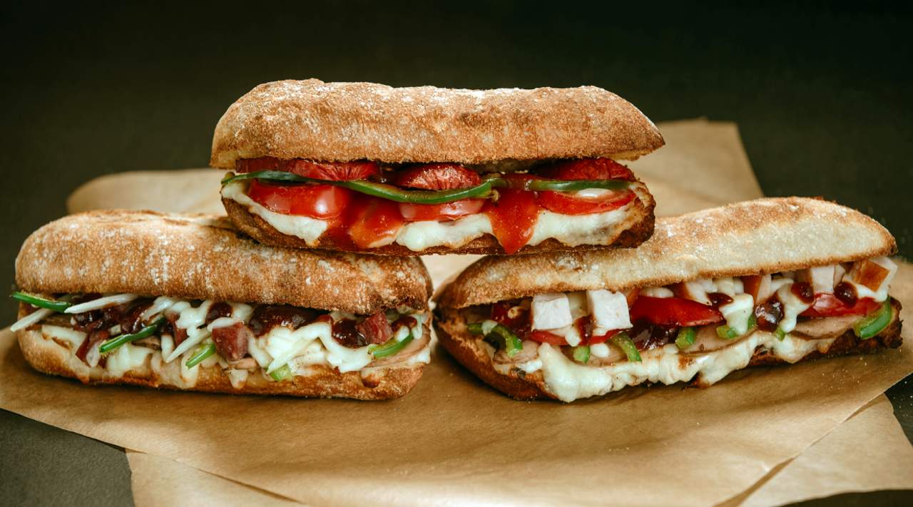 Pan cristal de masa madre con una base de queso cremoso, rúcula, tomates cherrys confitados en umami y pastrami al fallo