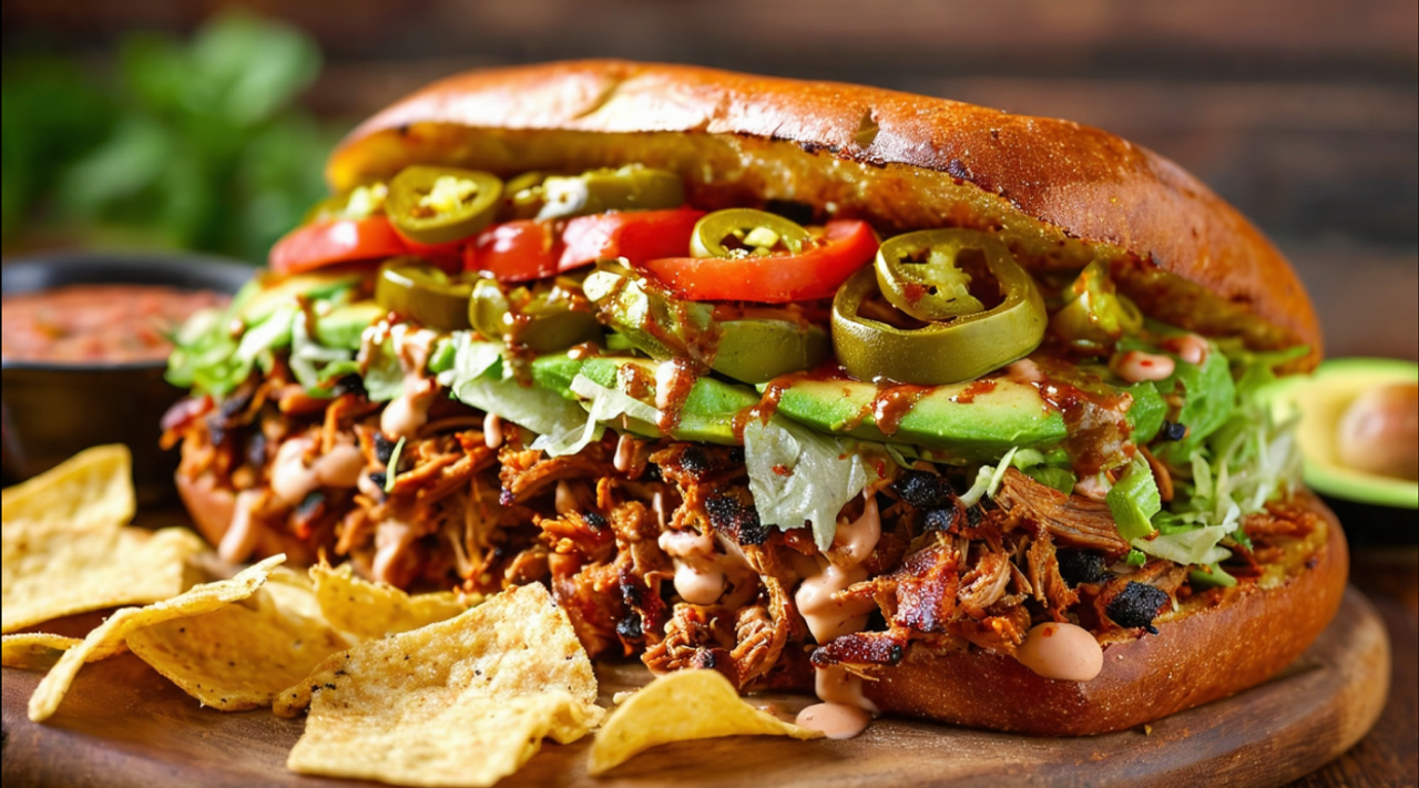 Pechugas de pollo mechadas, acompañadas con pico de gallo, guacamole.